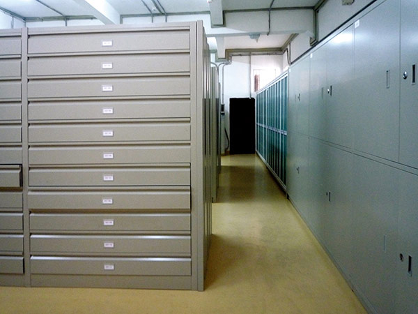 多年以來,邦達投入大量的人力、物力研發適合于文博系統藏品庫專用密集架和其他儲藏設備,設計和定制了一批又一批批結構合理、款式新穎、質量上乘、非常適合客戶使用的藏品設備。邦達的重型密集架技術解決了“超重、超大、超長”等問題;專利滑軌技術解決了抽屜類儲藏家(柜)安全等問題;為消除和減輕地震時對藏品的損害,還研發成功了幾種類型密集儲藏架底盤防震減震裝置、頂部/底部防傾倒裝置,此外還研發了密集架防水、防塵、防鼠裝置。